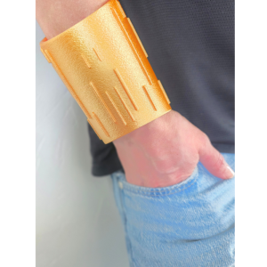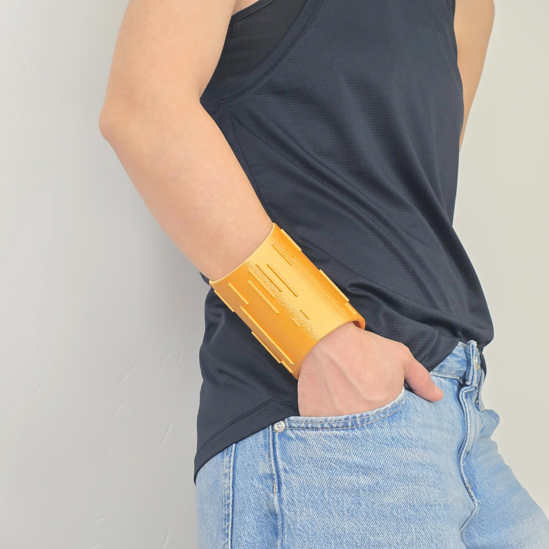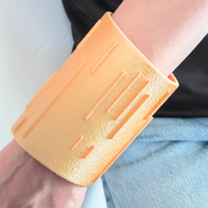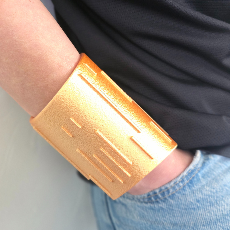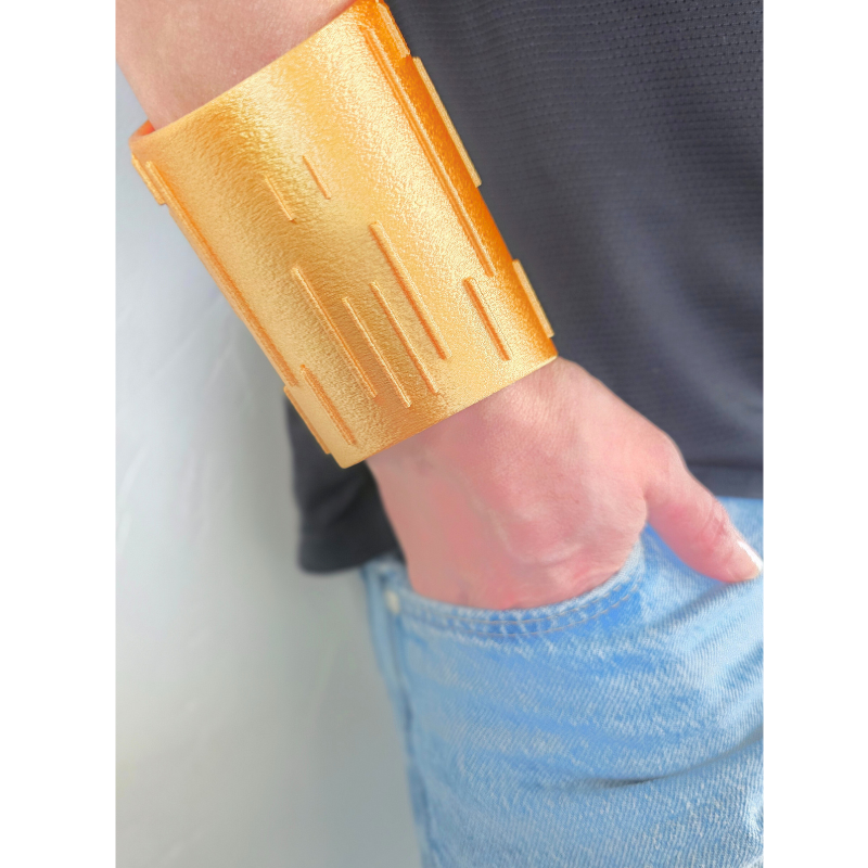 Vectra – Brățară aurie imprimată 3D din PLA ecologic, este un accesoriu statement modern, ușor și confortabil. Perfectă pentru stil urban, casual sau festivaluri.