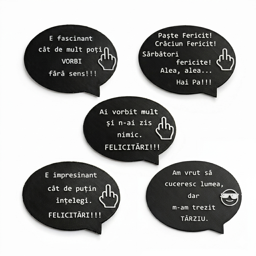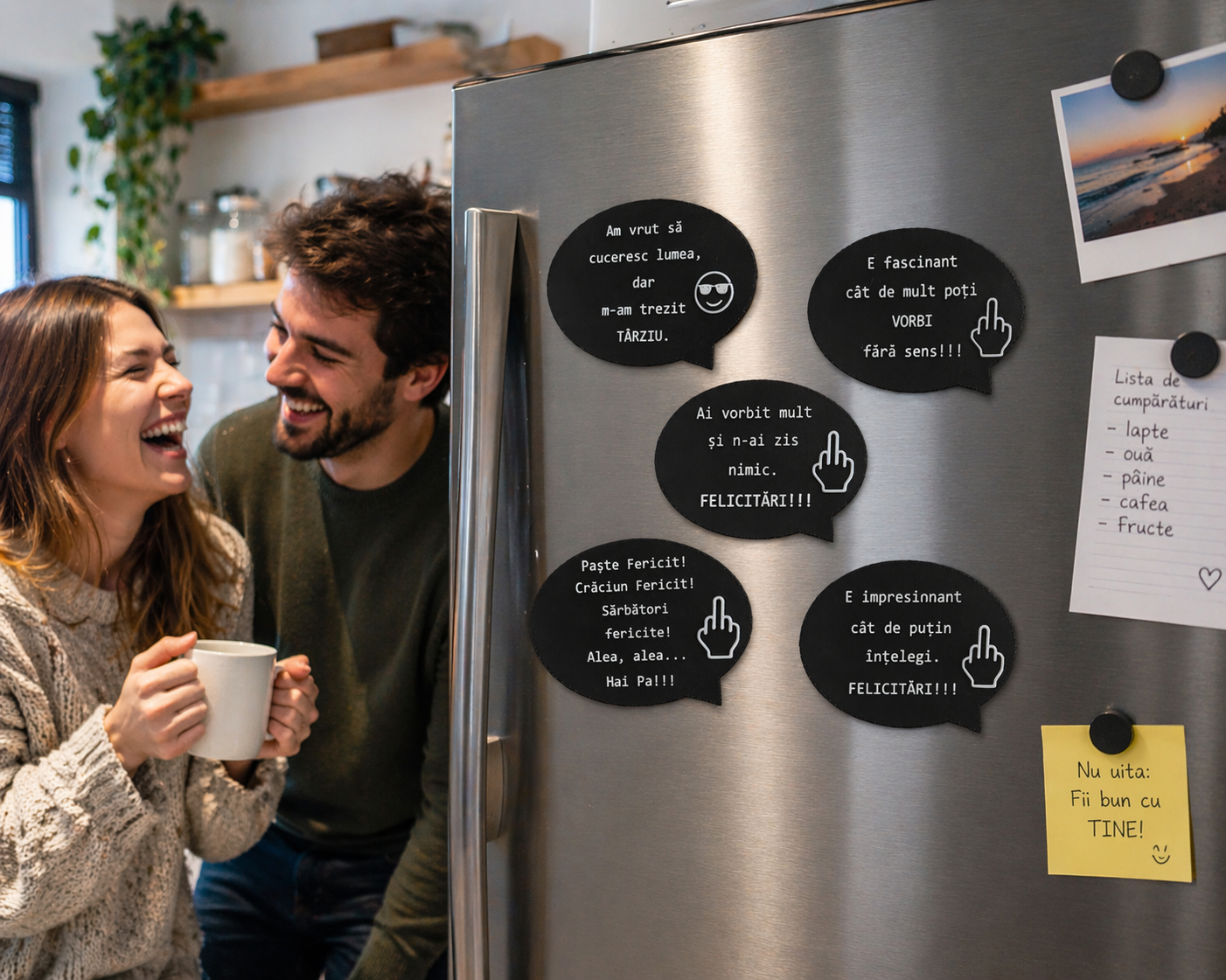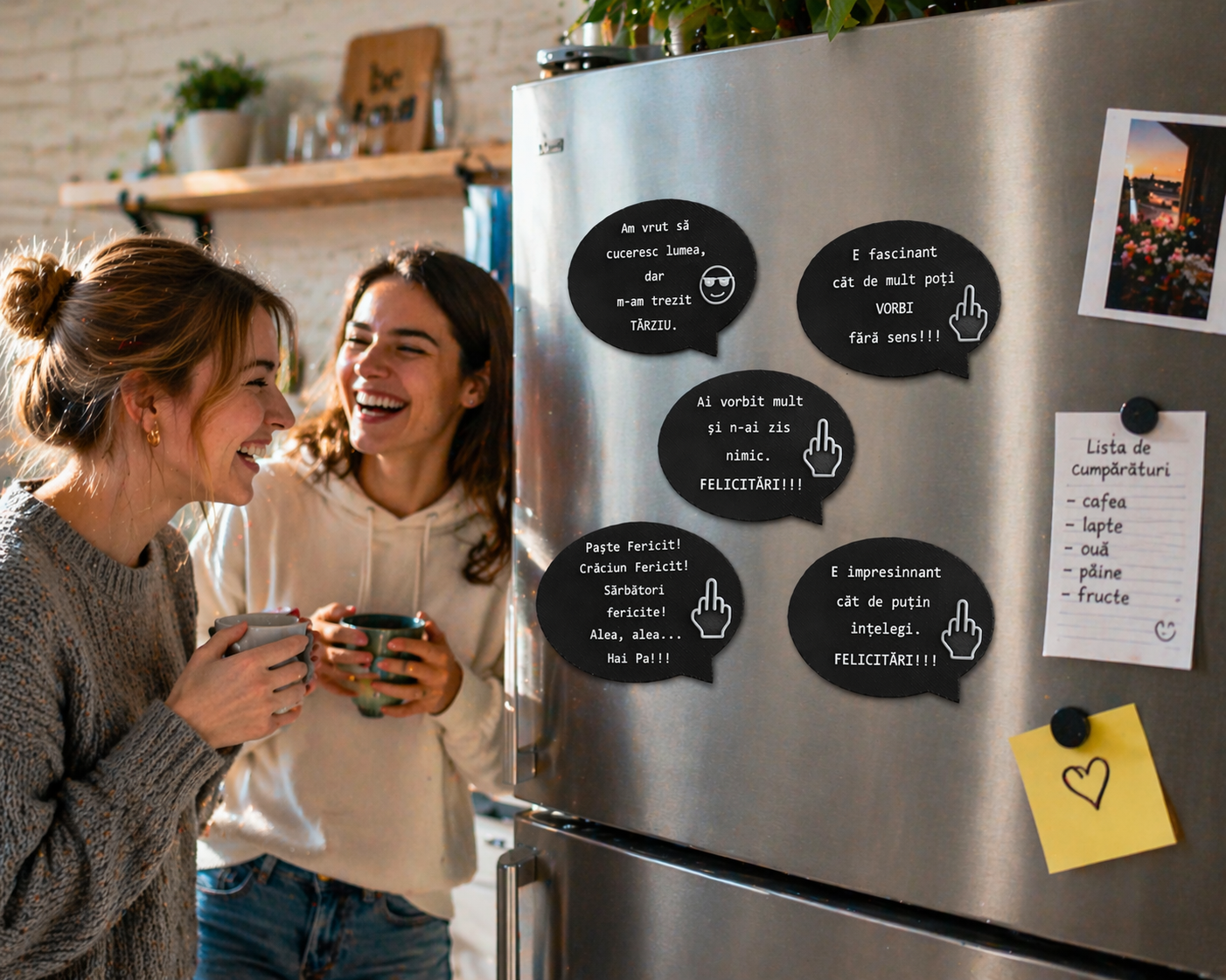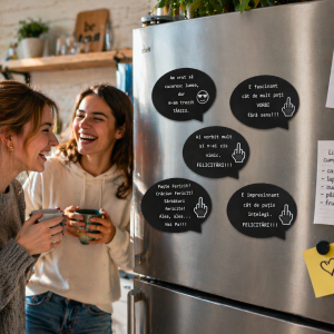 Designul minimalist, cu fundal negru și text alb, pune mesajul în prim-plan, iar forma de bulă de dialog transformă fiecare magnet într-o replică spusă exact când trebuie.